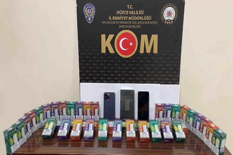 DÜZCE(İHA) – Düzce İl Emniyet Müdürlüğü ekiplerince yapılan çalışmada uyuşturucu, kaçak cep telefonu, elektronik sigara, sahte plaka ve sahte çek ele geçirildi.