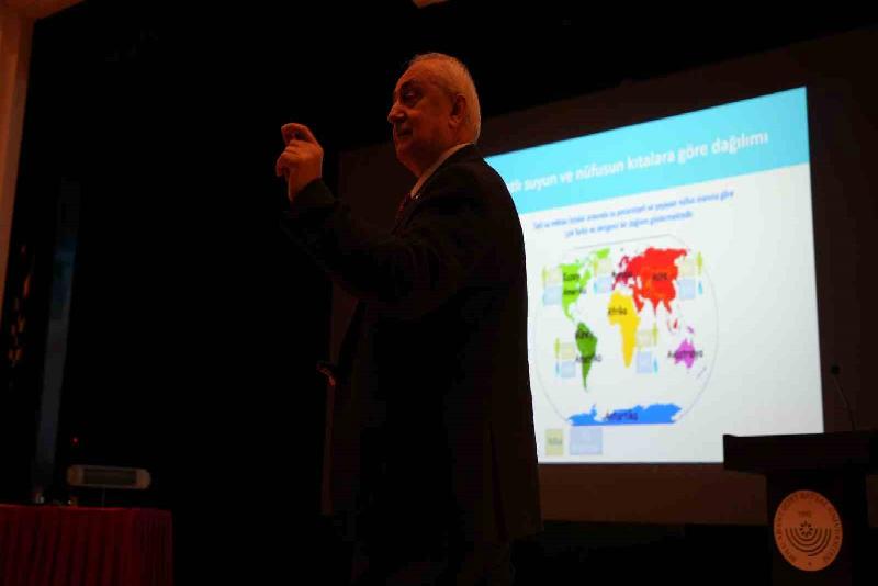 Prof. Dr. Yusuf Demir, “Dünyanın 4’te 3’ü su ama bu 4’te 3’ünün tamamı kullanılabilir bir su değil. Büyük çoğunluğu tuzlu su. Kullanabilecek tatlı su oranı dünyada yüzde 3. Peki, bu yüzde üçlük suyu kullanabiliyor muyuz? Onu da kullanamıyoruz. Büyük çoğunluğu ya buzulların altında ya göllerin, denizlerin altında. 8 milyar insanı şu anda kullanabildiği su 0.0003. Var olan su. Bu suyun dünyadaki dağılımı da çok enteresan. Bazı kıtalarda fazla su varken bizim bulunduğumuz coğrafya oldukça sınırlı. Türkiye’yi yıllarca bize yanlış anlattılar. Türkiye’yi su zengini diye anlattılar. Türkiye su zengini falan değil. Türkiye su fakirliği sınırında bir ülke. Bir ülkenin su zengini olabilmesi için 8 bin metreküp kişi başına su kullanabilmesi lazım”