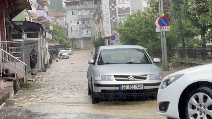 Zonguldak’ın Gökçebey ilçesinde etkili olan kuvvetli yağışla dereler yükseldi, rögarlardan su taştı.
