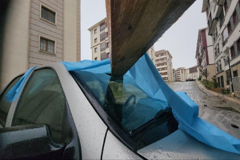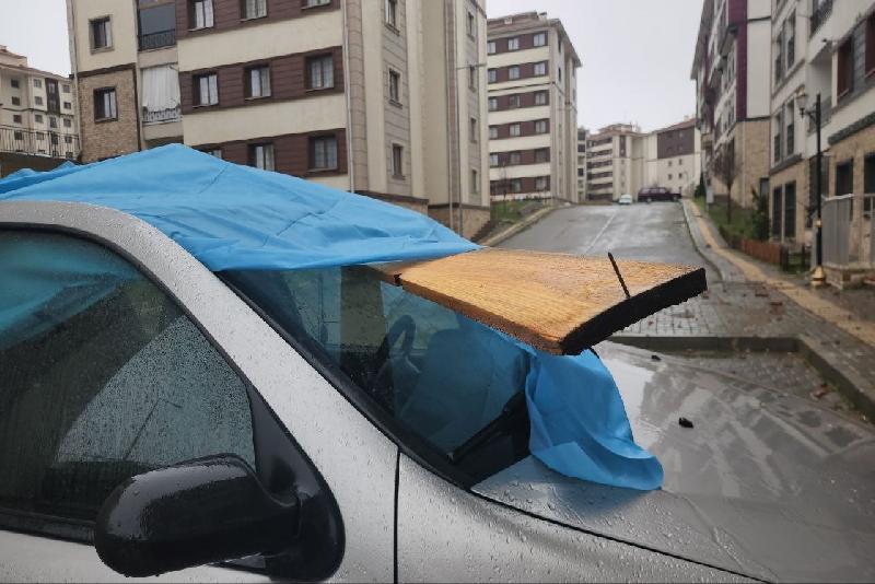 Belenköy mevkiinde de şiddetli rüzgar nedeniyle çatıdan uçan tahta parçası bir otomobilin camına saplanırken, düşen kremitler ise 4 araca zarar vererek maddi hasar oluşturdu.