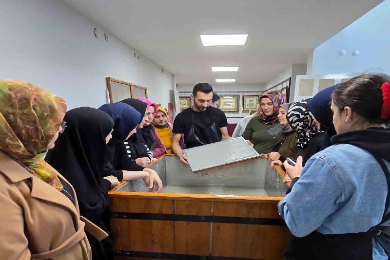 Düzce Üniversitesi Sanat Tasarım ve Mimarlık Fakültesi Geleneksel Türk Sanatları Bölüm Başkanı Doç. Dr. Yusuf Parlak, Kağıt Atölyesi’nde Kaynaşlı Meslek Yüksekokulu El Sanatları Bölümü öğrencilerine sanat eserleri için el yapımı kağıt ürettirdi.