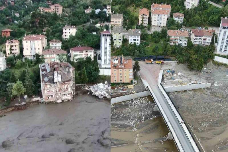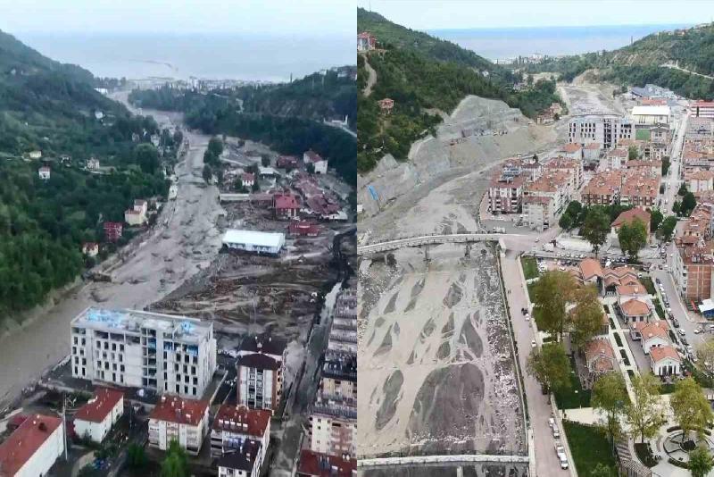 Yeniden inşa edilen ilçedeki değişim ise 11 Ağustos sel afetinin ertesi günü ve 2 yıl sonra aynı açılardan çekilen dron görüntüleri ile gözler önüne serildi.