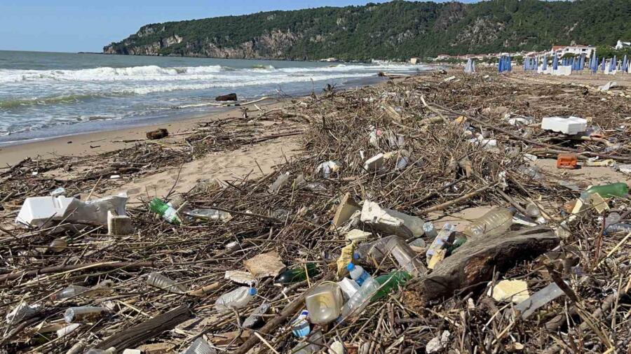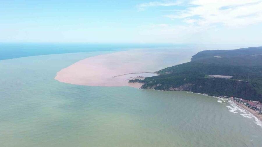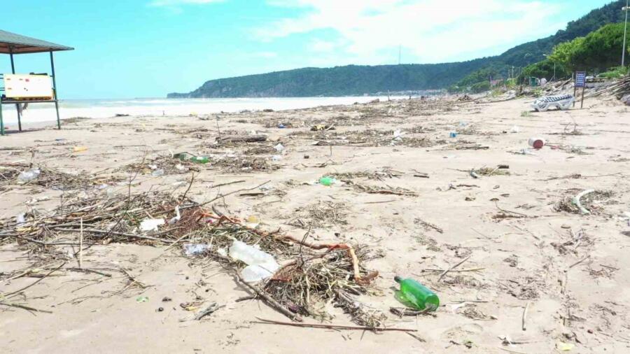 Bartın’da sağanak sonrası taşan ırmağın denize sürüklediği atıkların sahilde oluşturduğu kirlilik dron ile görüntülendi.