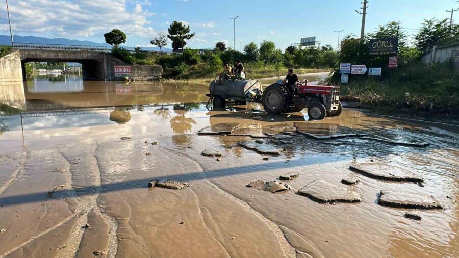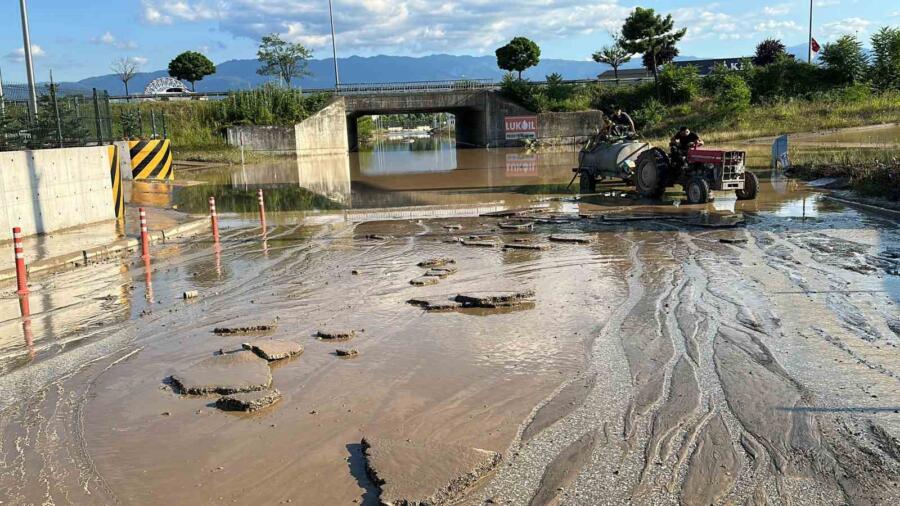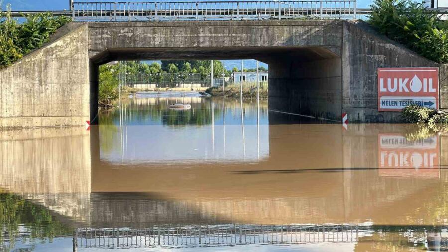 Düzce‘de hafta sonu etkili olan sağanak yağış bir çok derenin taşmasına sebep oldu. Melen çayının taşması ile birlikte küçük sanayi sitesinde bulunan alt geçit sular altında kaldı. Asfaltı söken sel suları bir araca da yuttu. Düzce‘de sağanak yağışın etkili olduğunu ve bir çok bölgede su taşkınların meydana geldiğini belirten Hakan Arslan, “Cumartesi ve pazar günleri Düzce‘de çok etkili bir sağanak yağış oldu. Dereden taşan sular burada asfaltı yerinden kaldırıp köprünün altına kadar almış. Asfaltı yerinden sökmüş. Köprünün altında da bir araç var. Sular çekilince neler çıkacak belli değil” ifadelerini kullandı.
