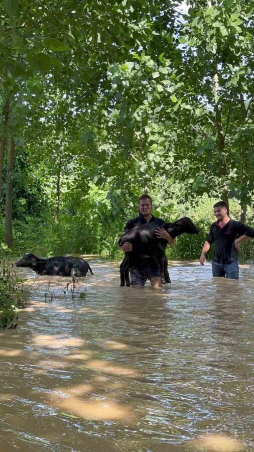 Düzce’de etkili olan selde çok sayıda hayvan telef olurken, bazı bölgelerde mahsur kalan büyükbaş hayvanların kurtarılması için çalışma başlatıldı. Bot yardımı ile Efteni gölü çevresinde bulunan meralarda 2 gündür mahsur kalan 100’e yakın manda ve inek vatandaşlar tarafından kurtarıldı.