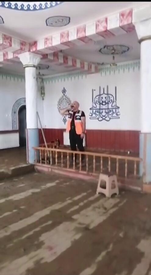 Zonguldak’ın Beycuma beldesinde sel sularıyla kaplanan Merkez Cami’de temizlik çalışmaları sürüyor. Temizlik çalışmalarına katılmak üzere beldeye gelen AFAD gönüllüsü, vakit ezanını okudu. O anlar ise amatör kameraya yansıdı.