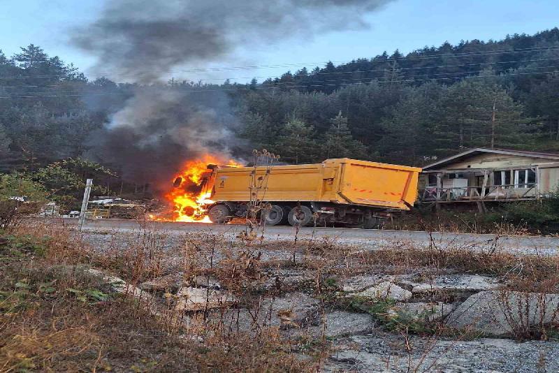 Kastamonu’nun Devrekani ilçesinde seyir halindeyken alevlere teslim olan hafriyat kamyonu kullanılmaz hale geldi.
