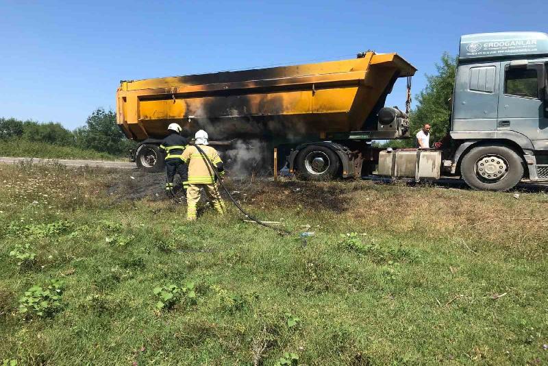 Zonguldak’ın Çaycuma ilçesine bağlı Nebioğlu beldesi yolunda seyir halindeki iş kamyonun lastikleri alev aldı. İtfaiye ekiplerinin müdahalesi ile yangın söndürüldü.