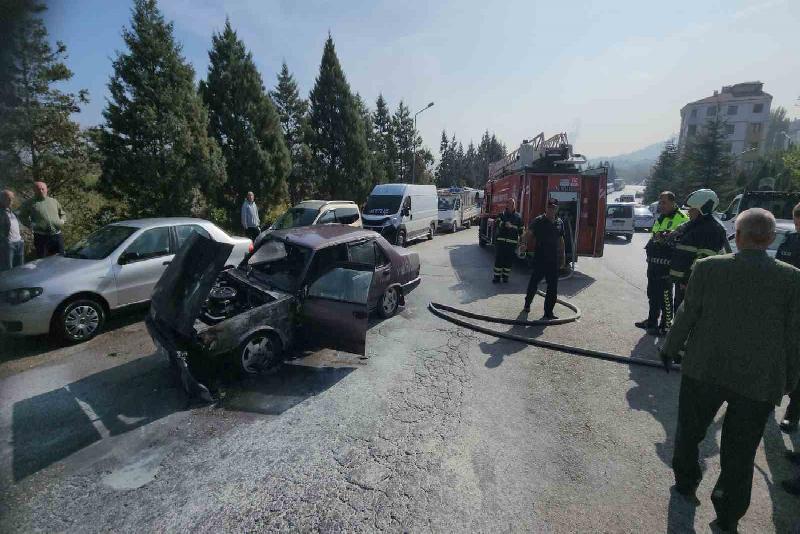 Karabük’te seyir halindeki otomobil motor kısmından alev aldı. Sürücüsünün kendisini dışarı atarak kurtulduğu yangına vatandaşlar su bidonları ve sürücü bezle müdahale ederken, yangın itfaiye ekiplerinin müdahalesi ile söndürüldü.