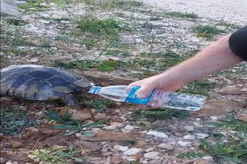 Kastamonu’da bir vatandaş, sıcak sebebiyle bitkin düşmüş halde bulduğu kaplumbağaya elleriyle su içirerek kendine gelmesini sağladı.