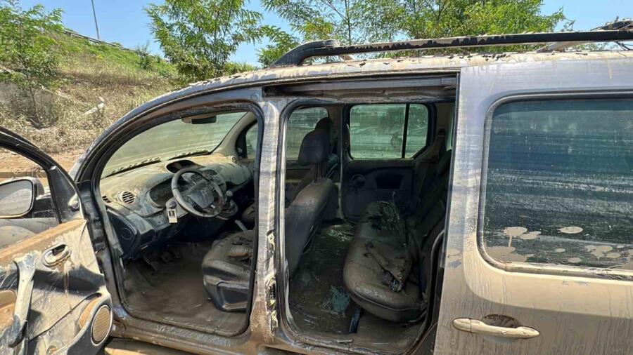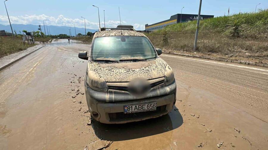 Düzce’de sele kapılan araç, suların çekilmesiyle gün yüzüne çıktı. Her yeri çamur olan aracın kullanılamaz hale geldiği görüldü.