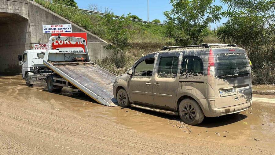 Düzce’de geçtiğimiz hafta sonu etkili olan sağanak yağışta Melen Çayı taştı, sanayi ve Galericiler Sitesi sular altında kaldı. Selde bir araçta sel sularına kapılmıştı. Suların çekilmesiyle tahribatın gün yüzüne çıktığı Düzce’de, sel sularına kapılan araç çıkarıldı. Köprü altında su altında kalan aracın içerisinde çamur birikintileri olduğu görüldü.
