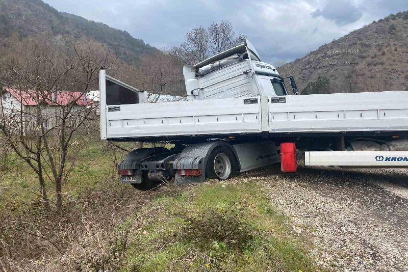 Bolu’nun Mudurnu ilçesinde kontrolden çıkan tır, şarampole yuvarlanmaktan son anda kurtuldu.