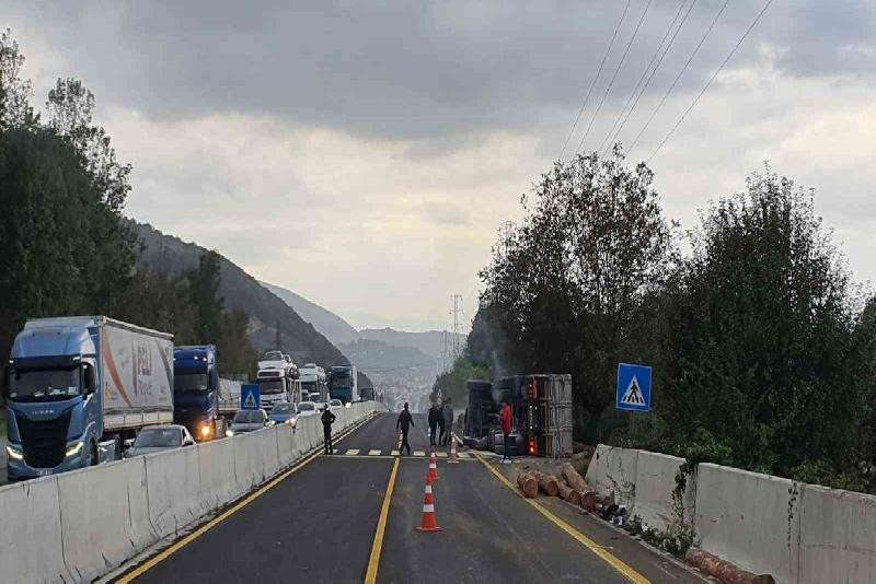 Bolu Dağı’nda tomruk yüklü kamyon devrildi. Yol kısmen trafiğe kapandı.