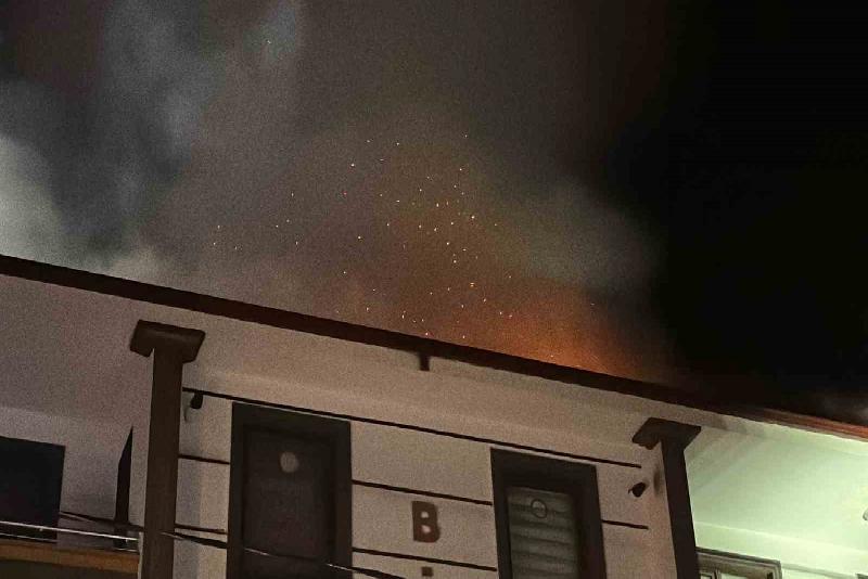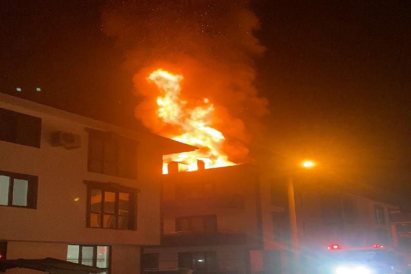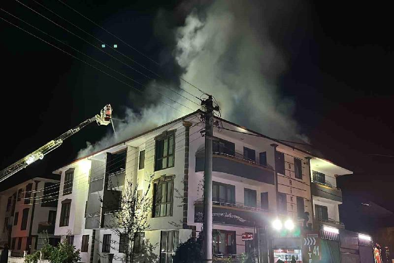Düzce’de 3 katlı binanın çatı katında trafo patlaması sebebi ile çıkan yangında çatı alev alev yandı.