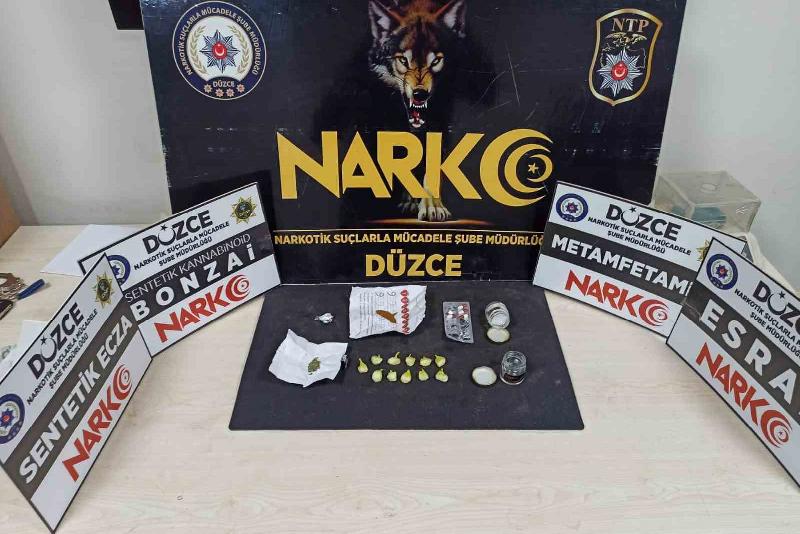Düzce’de Narkotik Suçlarla Mücadele Şube Müdürlüğünce uyuşturucu madde ticaretini önlenmesine çalışma başlatıldı. Yapılan çalışmalar neticesinde şüphe üzerine E.S. (36) isimli şahsın üstünde arama yapıldı. Aramada şahıs üstünde 13 parça halinde 27 gram metamfetamin, 1 gram skunk, 1 gram sentetik kannabinoid ele geçirildi. Malzemelere el koyulurken olayla ilgili şüpheli gözaltına alındı. İfadesi alınan E.S., çıkarıldığı mahkemece tutuklanarak cezaevine gönderildi.
