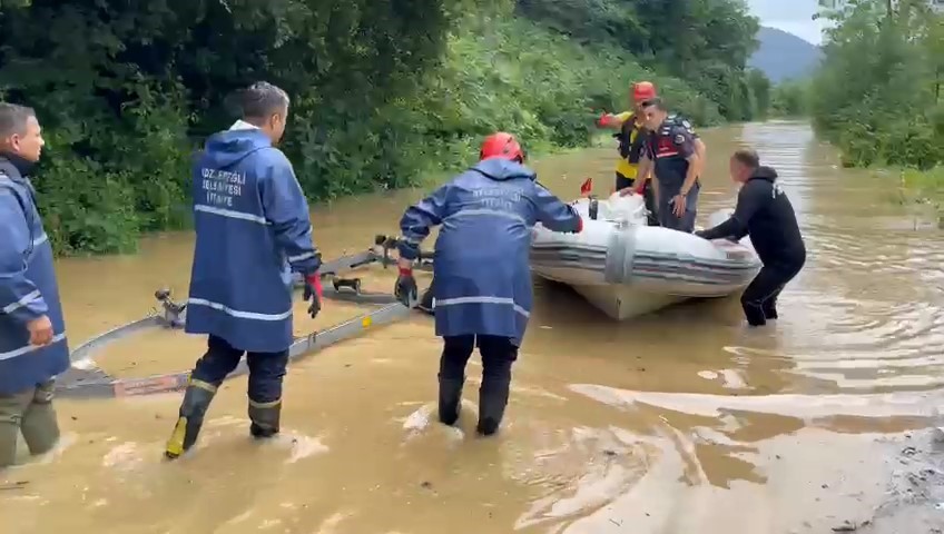 Zonguldak’ın Ereğli ilçesinde selde vatandaşları kurtarmaya giden jandarma ekipleri çayda mahsur kaldı. Ekipleri itfaiye botla kurtardı.