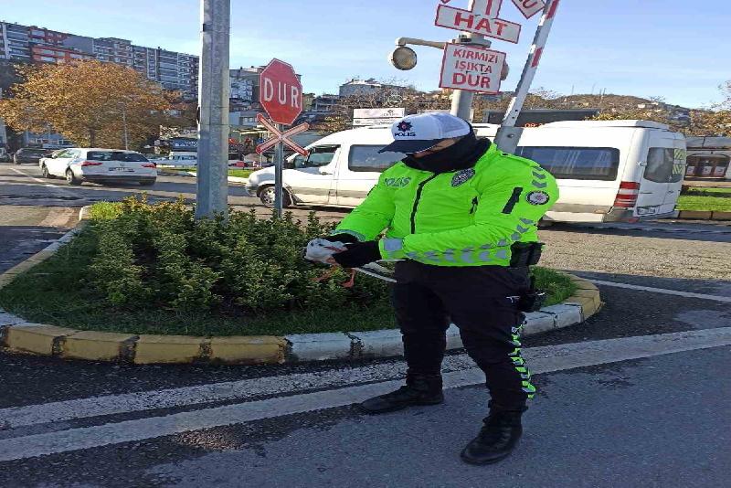 Zonguldak’ta trafiğin güvenli akışı için kavşakta görev alan polis ekipleri uçamayan yaralı haldeki martıyı koruma altına aldı.