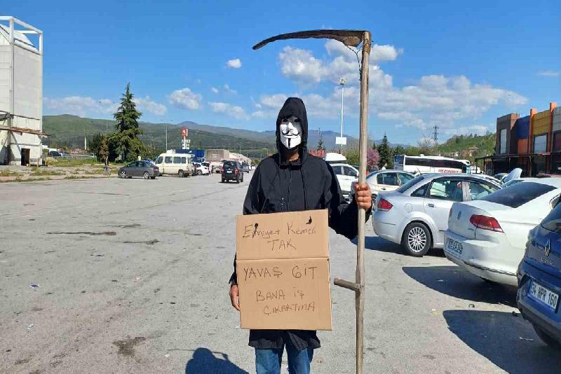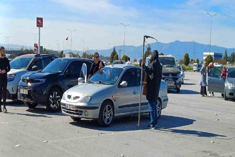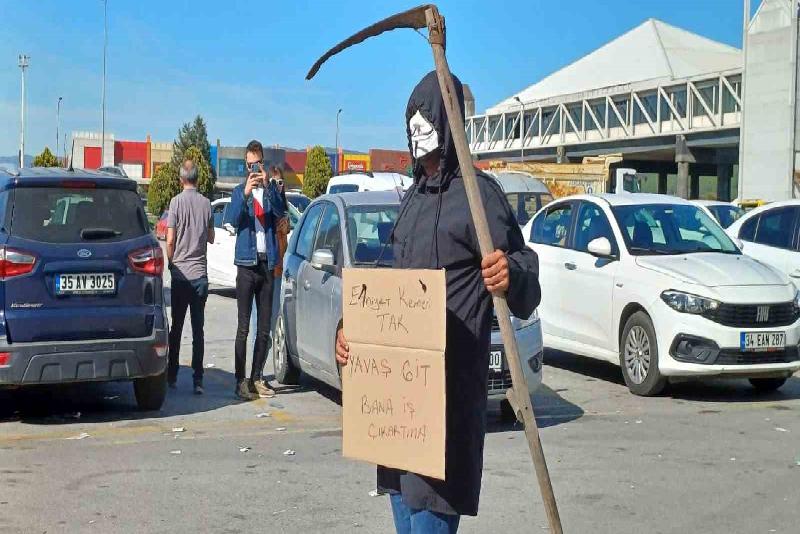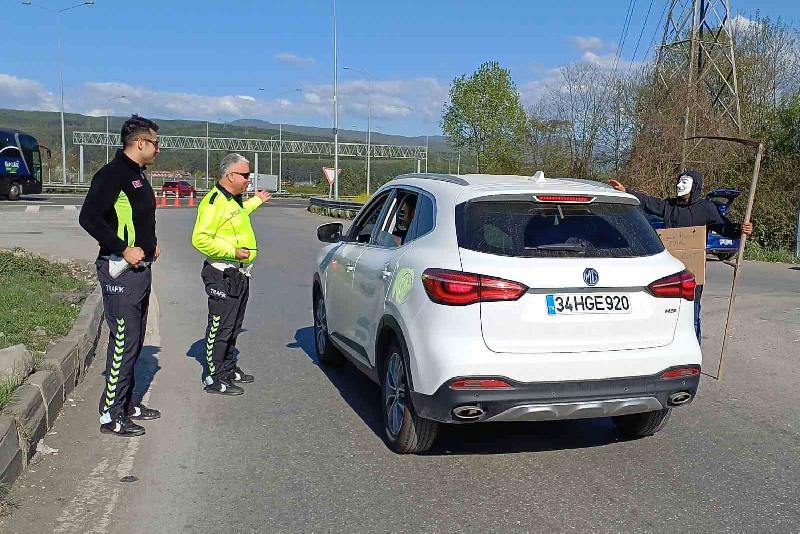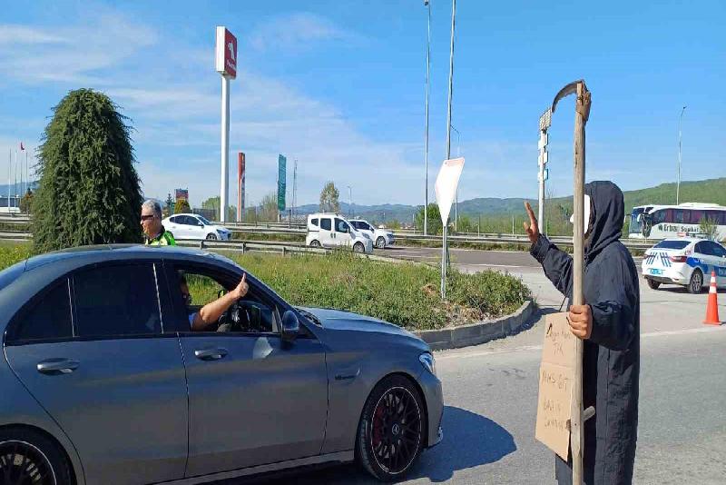 Trafik yoğunluğunda acı olayların yaşanmasını istemeyen motokurye Resul Gür ise ilginç bir çalışmaya imza attı. Yüzüne maske takıp, eline tırpan alan Gür, boynuna da “Emniyet kemerini tak, yavaş git” yazılı pankart asarak, sürücüleri uyardı. Genci gören vatandaşlar ise cep telefonlarının kameralarıyla o anları kayda aldı.