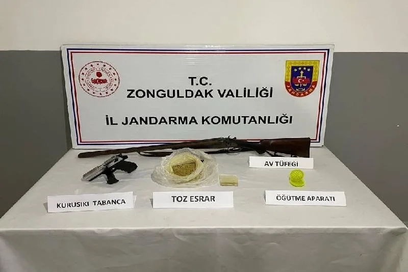 Kaçakçılık ve Organize Suçlarla Mücadele Şube Müdürlüğü ve Zonguldak Jandarma Komutanlığınca şüphelilerin Adli makamlardan alınan yapılan aramada,(605) gram Esrar,(216) gram Metamfetamin,(4) gram Kokain,(8) gram Bonzai,(129) adet Sentetik hap,(1) adet Hassas terazi,(2) adet 9mm Tabanca,(49) adet 9 mm Tabanca fişeği,(5) adet Av tüfeği,(30) adet Av tüfeği fişeği,(10) Dijital materyal ele geçirildi. Olayla ilgili Cumhuriyet Başsavcılığının talimatları doğrultusunda Uyuşturucu Madde Kullanmak, Bulundurmak suçundan (15) şahıs ifadesinin alınmasına müteakip serbest bırakıldı. Uyuşturucu/Uyarıcı Madde İmal ve Ticareti Yapma suçundan Adliyeye sevk edilen (6) şüpheli şahıstan (2) şahıs Adli Kontrol Şartıyla serbest bırakılırken,(4)şüpheli çıkarıldıkları mahkeme tarafından tutuklanarak cezaevine gönderildi.