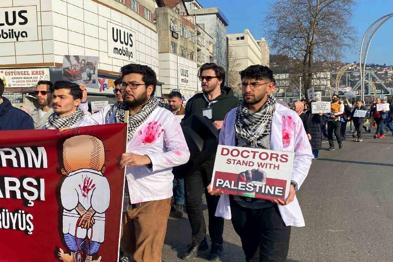 Zonguldak’ta doktorlar İsrail’in Filistin saldırılarına tepki göstermek amacıyla kanlı önlüklerle yürüyüş yaptı.