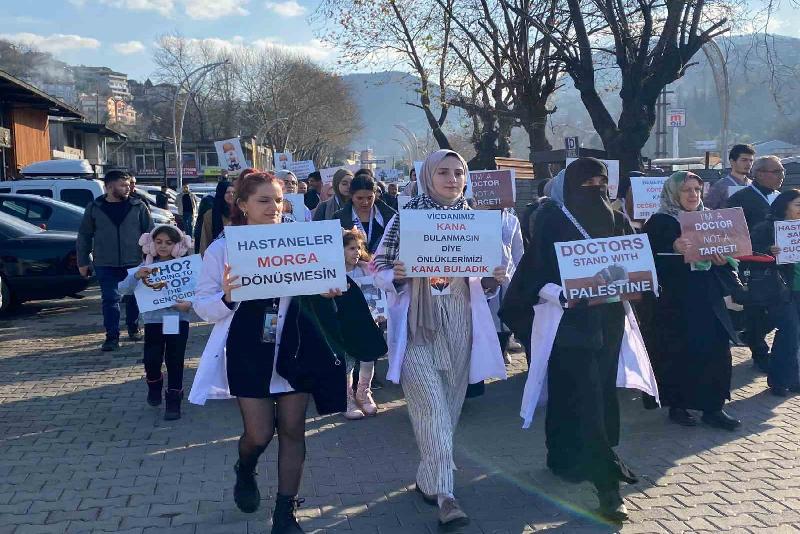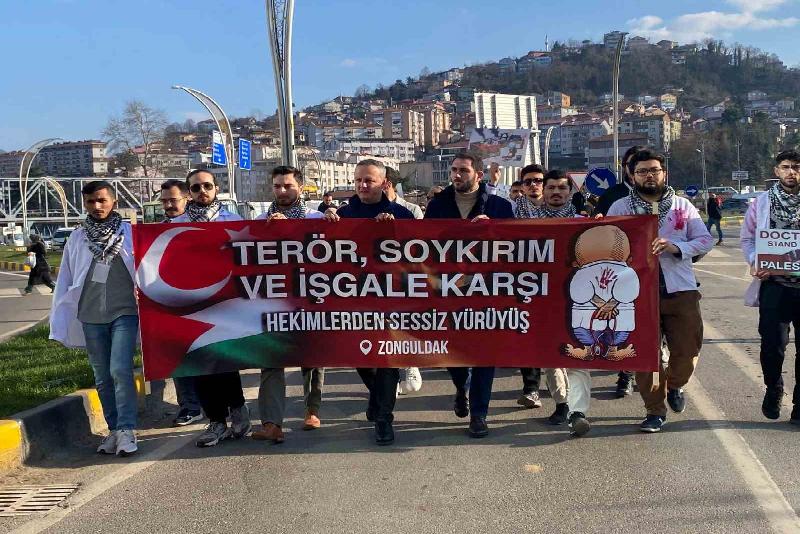 Yürüyüşe, Zonguldak Belediye Başkanı Ömer Selim Alan, AK Parti Gençlik Kolları Başkanı Benhur Özübek, doktorlar ve vatandaşlar katıldı. İstasyon Caddesi’nde başlayan yürüyüş Gazipaşa Caddesi’nde sona erdi. Doktora adına açılama yapan Mehmet Rasim Meriç, “Bizler Gazzeli kardeşlerimizin acısını yüreğimizde hissederken, bu acıya büyük bir acı daha eklendi. Filistinli kardeşlerimizin katledilmesine sebep olan karanlık ellerin desteklediği taşeron örgütler, Kuzey Irak’ta görev yapan askerlerimize hain saldırılarda bulundular. Bu hain saldırılarda 12 askerimiz hayatını kaybetti. Bu askerlerimize Allah’tan rahmet diliyor ve acılı ailelerine başsağlığı ve sabırlar diliyoruz. Yaralı askerlerimize de acil şifalar diliyoruz. Bizler biliyoruz ki, Filistin’de kardeşlerimizi katleden silahlar ile askerlerimize doğrultulan silahları aynı eller tutmaktadır. İsrail’in arkasında duran ülkeler ile taşeron terör örgütünün arkasında duran ülkeler aynı ülkelerdir ve aynı emperyalist çıkarları savunmaktadırlar. Ama başarılı olamayacaklardır. Hain emellerine kavuşamayacaklardır. Artık maskeler düşmüştür. Gerçekler ortaya çıkmıştır. İnsan haklarından bahsedenlerin mumları sönmüştür. Tüm dünyadan yükselen seslere ve feryatlara rağmen savaş suçları ve soykırımlar devam etmektedir. Çocuklar, bebekler, kadınlar ve masum siviller umarsızca bombalanmaktadır. Yaralıların tedavi edilmeye çalışıldığı hastaneler bombalanmaktadır. Yaralı taşıyan ambulanslar dahi hedef alınmaktadır. Gazze’de hala sağlıklı bir su kaynağı yok, elektrik yok, ulaşım yok; yemek kısıtlı, kalacak yer kısıtlı, can güvenliği yok. Gazze mi yoksa tüm dünyanın vicdanı mı yalnızlığa terk edildi? Peki sözde medeni dünya bu soykırımı durdurmak için daha neyi bekliyor, neden hala seyrediyor, neden müdahale etmiyor?